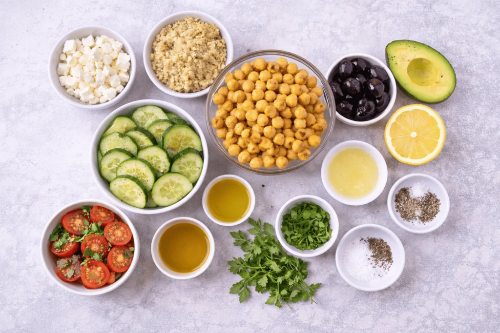 Tools: Cutting board, sharp knife, mixing bowl, small jar or whisk for dressing, strainer, and a pot if cooking quinoa or couscous.