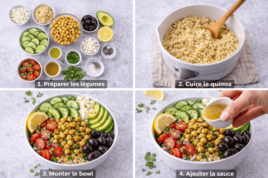 Assemble the base. Divide quinoa or couscous (if using) between bowls. If skipping grains, start with a bed of cucumbers and tomatoes for a lighter, lower-carb base.