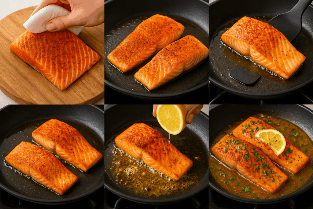 Overcrowding: Crowding drops pan temperature and steams the salmon; cook in batches if needed.
