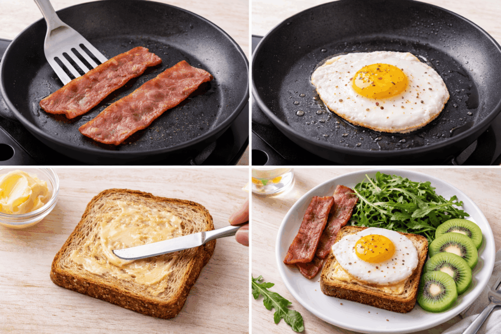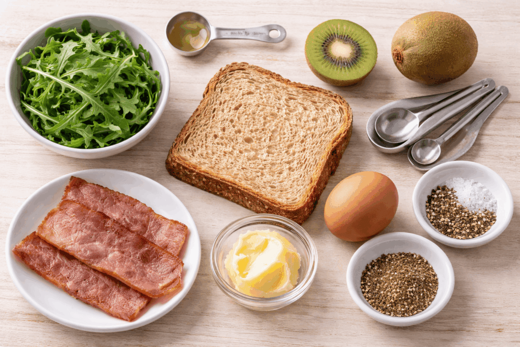 Start your day strong with this Turkey Bacon and Egg Breakfast Toast. This easy, high-protein breakfast layers peppery arugula over buttery whole-grain toast, then tops it with savory turkey bacon and a perfectly fried egg. A juicy kiwi on the side adds natural sweetness and vitamin C, making this Turkey Bacon and Egg Breakfast Toast a balanced, energizing meal you can assemble in minutes.